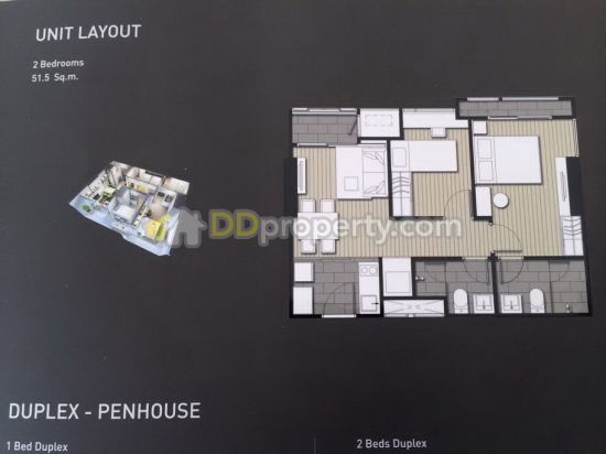 ขนาดของห้อง 51.5 ตรม. , 2 ห้องนอน , 2 ห้องน้ำ , 1 ห้องนั่งเล่น