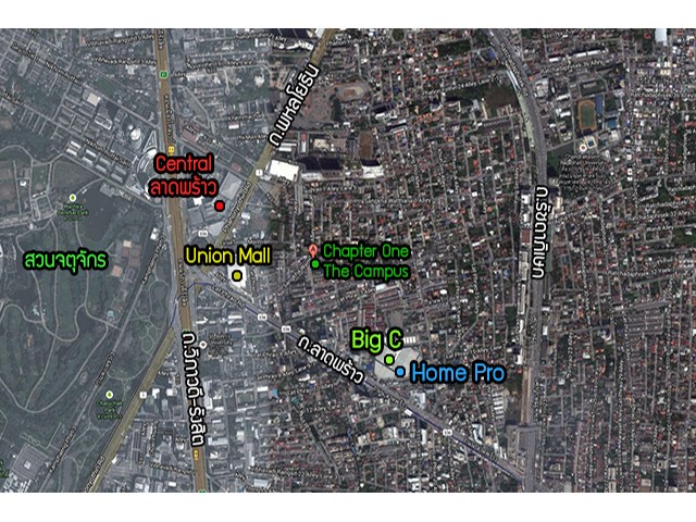 - ใกล้ศูนย์การค้า เซ็นทรัลลาดพร้าว, ยูเนียนมอล์, คาร์ฟูร์, Lotus, สวนจตุจักร และ Major รัชโยธิน