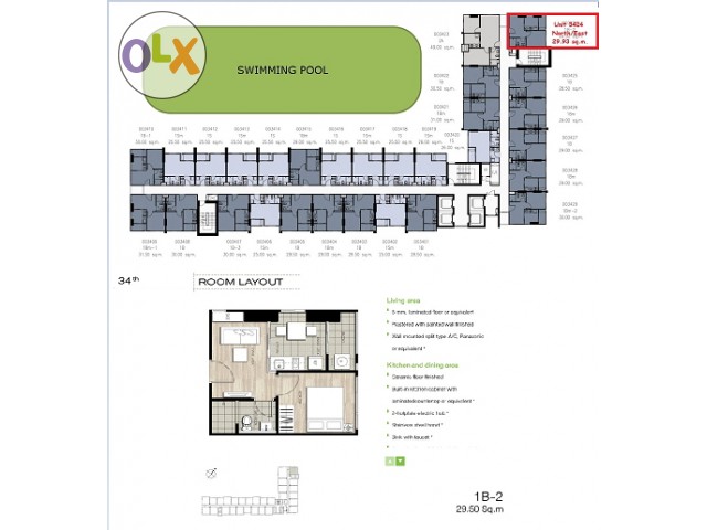 ขายดาวน์ ห้องมุมชั้น 34 Unit 3424 เป็นห้องราคา pre-sale ราคาตามหน้าสัญญา 2,030,100 บาท พท.ตามหน้าสัญญา 29.50 ตร.ม.(พท.จริง 29.93 ตร.ม.) บ้านเลขที่ 3/889 เป็นห้องมุมที่วิวสวยมากค่ะ ผนังไม่ติดใครเลย ชั้นสูง วิวดี อยู่ทิศตะวันออกเฉียงเหนือ อากาศเย็นตลอดปี ห้องมีหน้าต่างเยอะทำให้อากาศถ่ายเทสะดวก ห้องนอนหันหัวไปทางทิศตะวันออก ไม่มีเสาตรงหัวเตียงค่ะ.