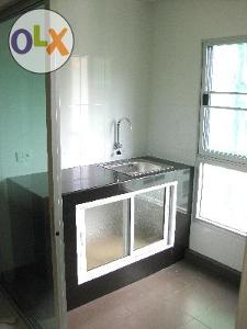 -พื้นห้องปูกระเบื้องแกรนิตโต้ขาว แยกโซนครัวพร้อมอ่างล้างจาน ระเบียงกว้างรับลม