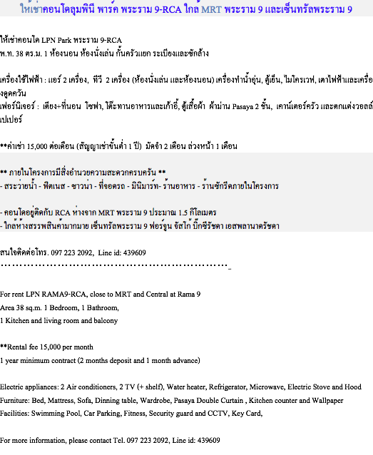 ให้เช่าคอนโดลุมพินี พาร์ค พระราม 9-RCA ใกล้ MRT พระราม 9 และเซ็นทรัลพระราม 9 ให้เช่าคอนโด LPN Park พระราม 9-RCA พ.ท. 38 ตร.ม. 1 ห้องนอน ห้องนั่งเล่น กั้นครัวแยก ระเบียงและซักล้าง เครื่องใช้ไฟฟ้า : แอร์ 2 เครื่อง, ทีวี 2 เครื่อง (ห้องนั่งเล่น และห้องนอน) เครื่องทำน้ำอุ่น, ตู้เย็น, ไมโครเวฟ, เตาไฟฟ้าและเครื่องดูดควัน เฟอร์นิเจอร์ : เตียง+ที่นอน โซฟา, โต๊ะทานอาหารและเก้าอี้, ตู้เสื้อผ้า ผ้าม่าน Pasaya 2 ชั้น, เคาน์เตอร์ครัว และตกแต่งวอลล์เปเปอร์ **ค่าเช่า 15,000 ต่อเดือน (สัญญาเช่าขั้นต่ำ 1 ปี) มัดจำ 2 เดือน ล่วงหน้า 1 เดือน ** ภายในโครงการมีสิ่งอำนวยความสะดวกครบครัน ** - สระว่ายน้ำ - ฟิตเนส - ซาวน่า - ที่จอดรถ - มินิมาร์ท- ร้านอาหาร - ร้านซักรีดภายในโครงการ - คอนโดอยู่ติดกับ RCA ห่างจาก MRT พระราม 9 ประมาณ 1.5 กิโลเมตร - ใกล้ห้างสรรพสินค้ามากมาย เซ็นทรัลพระราม 9 ฟอร์จูน จัสโก้ บิ๊กซีรัชดา เอสพลานาดรัชดา สนใจติดต่อโทร. 097 223 2092, Line id: 439609 …………………………………………………….. For rent LPN RAMA9-RCA, close to MRT and Central at Rama 9 Area 38 sq.m. 1 Bedroom, 1 Bathroom, 1 Kitchen and living room and balcony **Rental fee 15,000 per month 1 year minimum contract (2 months deposit and 1 month advance) Electric appliances: 2 Air conditioners, 2 TV (+ shelf), Water heater, Refrigerator, Microwave, Electric Stove and Hood Furniture: Bed, Mattress, Sofa, Dinning table, Wardrobe, Pasaya Double Curtain , Kitchen counter and Wallpaper Facilities: Swimming Pool, Car Parking, Fitness, Security guard and CCTV, Key Card, For more information, please contact Tel. 097 223 2092, Line id: 439609