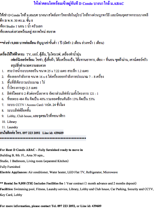 ขายคอนโดโครงการ D condo ดีคอนโด อ่อนนุช สุวรรณภูมิ ลาดกระบัง - 2650000 บาท ติดต่อคุณ คุณ คุณ