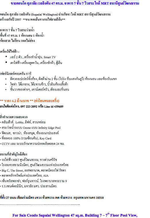 ขายคอนโดโครงการ ศุภาลัย เวลลิงตัน | Supalai Wellington - 4200000 บาท ติดต่อคุณ Thitinan Thitinan