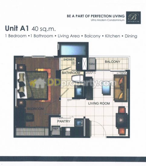 Type : 1 bed room, 1 baht room, living area, kitchen, dining area, balcony