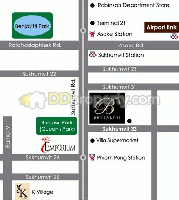 Beverly33 sits amid one of the most desirable area of Bangkok. This location provides an easy access to Emporium mall, Terminal 21, K-Village, Big-C, Tesco Lotus, Phromphong BTS station, Villa supermarket, Benjasiri park, Kasikorn Bank, Bank of Ayudhaya, international schools, embassies, restaurants, hospitals, shopping malls, and nightlife attractions