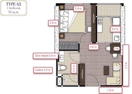 - ชนิด 1 ห้องนอน 1 ห้องน้ำ