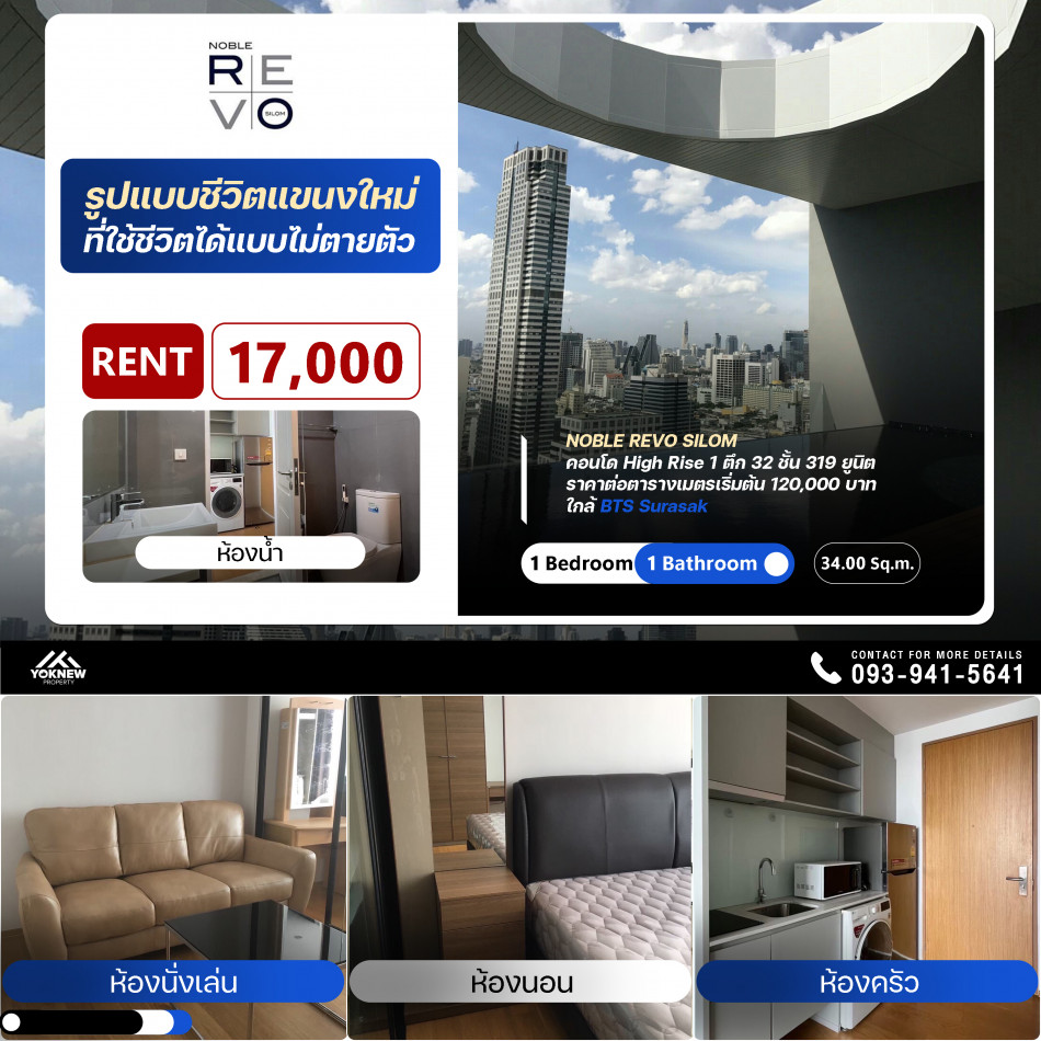 ให้เช่า คอนโด NOBLE REVO SILOM รูปแบบ 1 ห้องนอน ขนาด 34 ตารางเมตร ชั้น 19