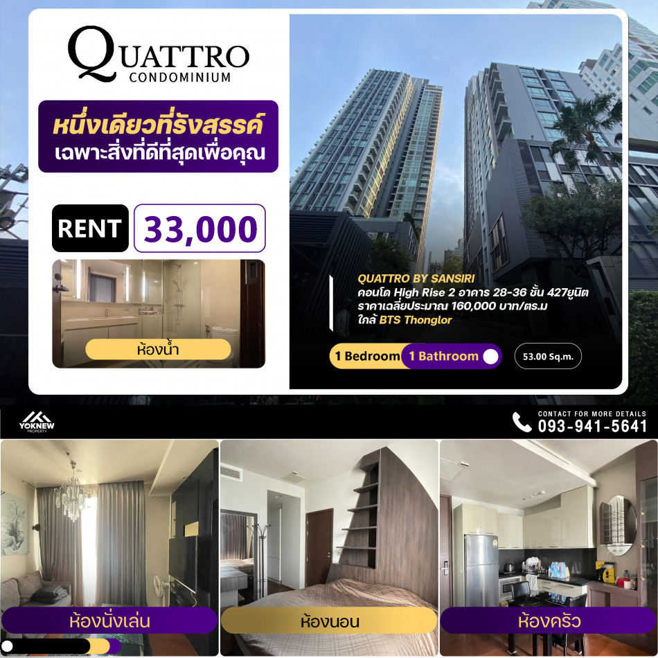 ว่างเช่าคอนโด Quattro By Sansiri ห้องราคาดีมาก ลดพิเศษ เช่าราคา 85,000 บาทใกล้ BTS ทองหล่อ