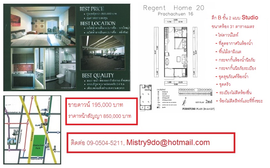 ขายคอนโดโครงการ Regent Home 20 | รีเจ้นท์โฮม 20 - 1,250,000.00 บาท ติดต่อคุณ เสาวภา วิชาดี